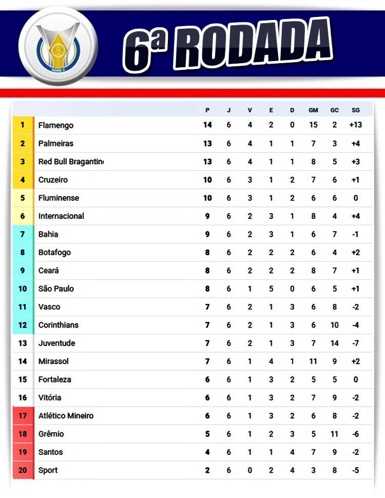 A sexta rodada do Campeonato Brasileiro da Série A foi encerrada neste domingo (27), com cinco jogos, destaque para o triunfo do Bahia sobre o Palmeiras, dentro do Allianz Parque, quebrando um tabu de 13 anos sem vencer o adversário em solo paulista. Além disso, foi o primeiro revés do Verdão na competição, quebrando uma sequência de nove jogos sem perder.