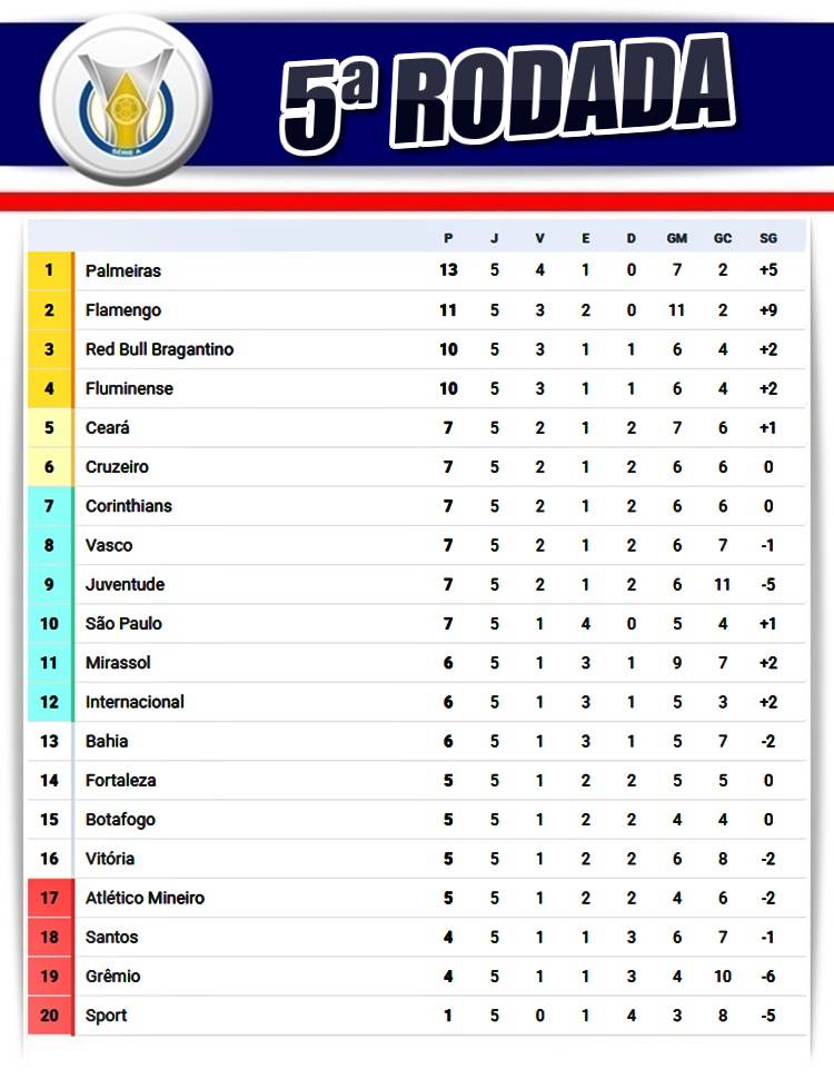 Na parte alta da tabela, o Palmeiras derrotou o Fortaleza por 2 a 1 na Arena Castelão e assumiu a liderança, com 13 pontos, superando o Flamengo, que apenas empatou com o Vasco, por 0 a 0, no Maracanã. Fluminense e Red Bull Bragantino, ambos com 10 pontos, completam o G-4.