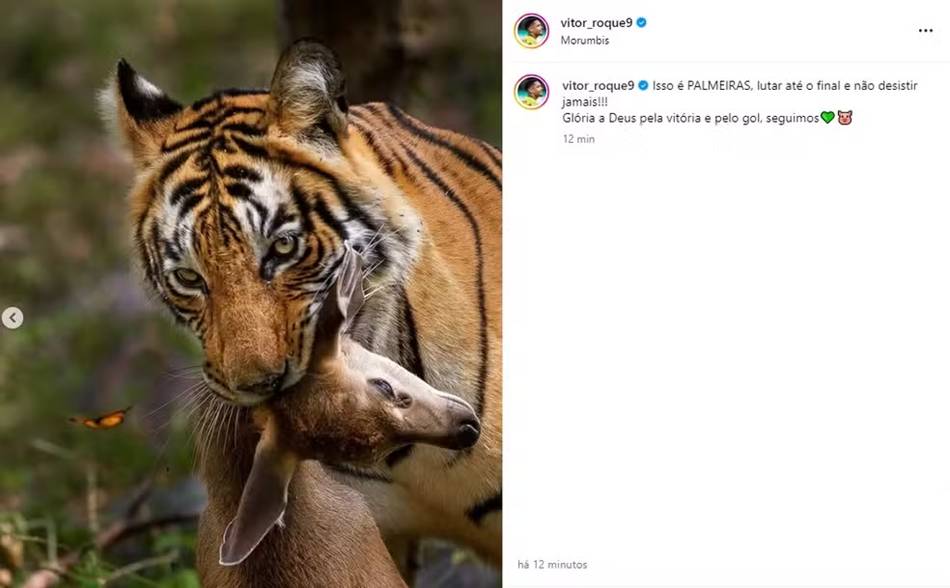 O centroavante postou uma imagem de um tigre (seu apelido) mordendo o pescoço de um veado.