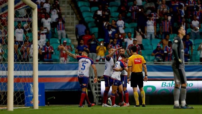 Jogadores do Bahia celebram triunfo sobre o Botafogo na Fonte Nova